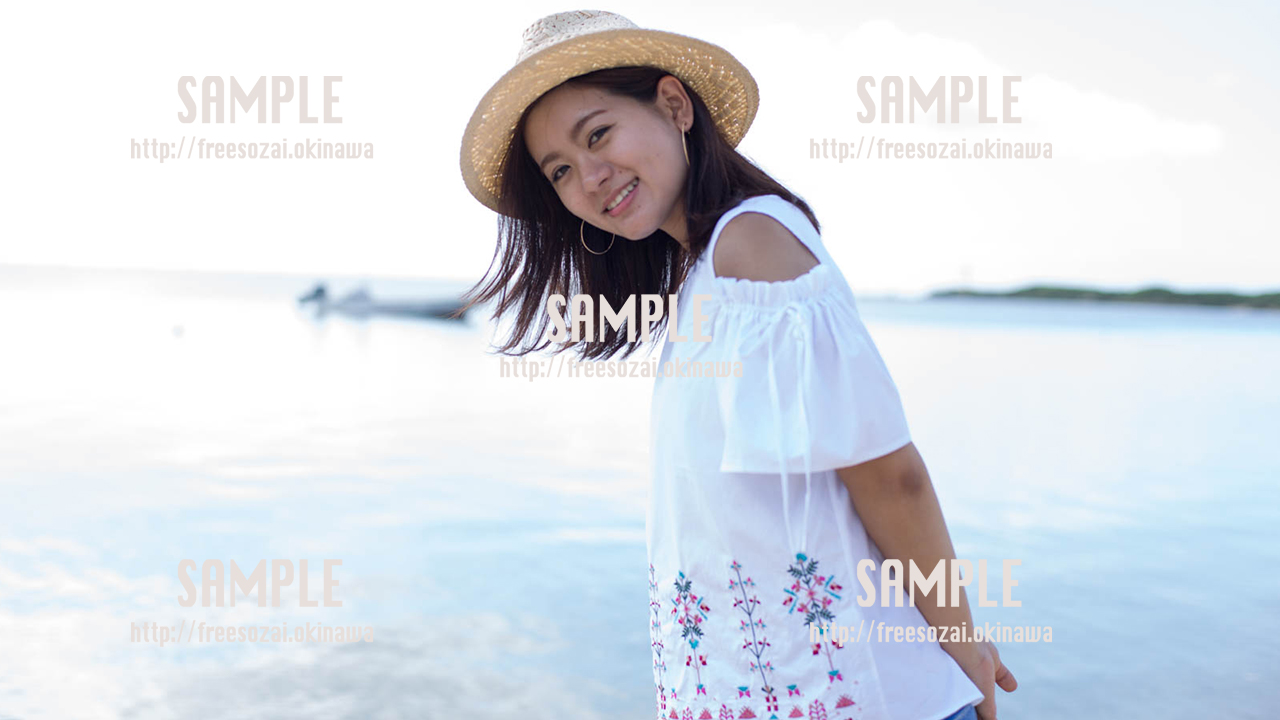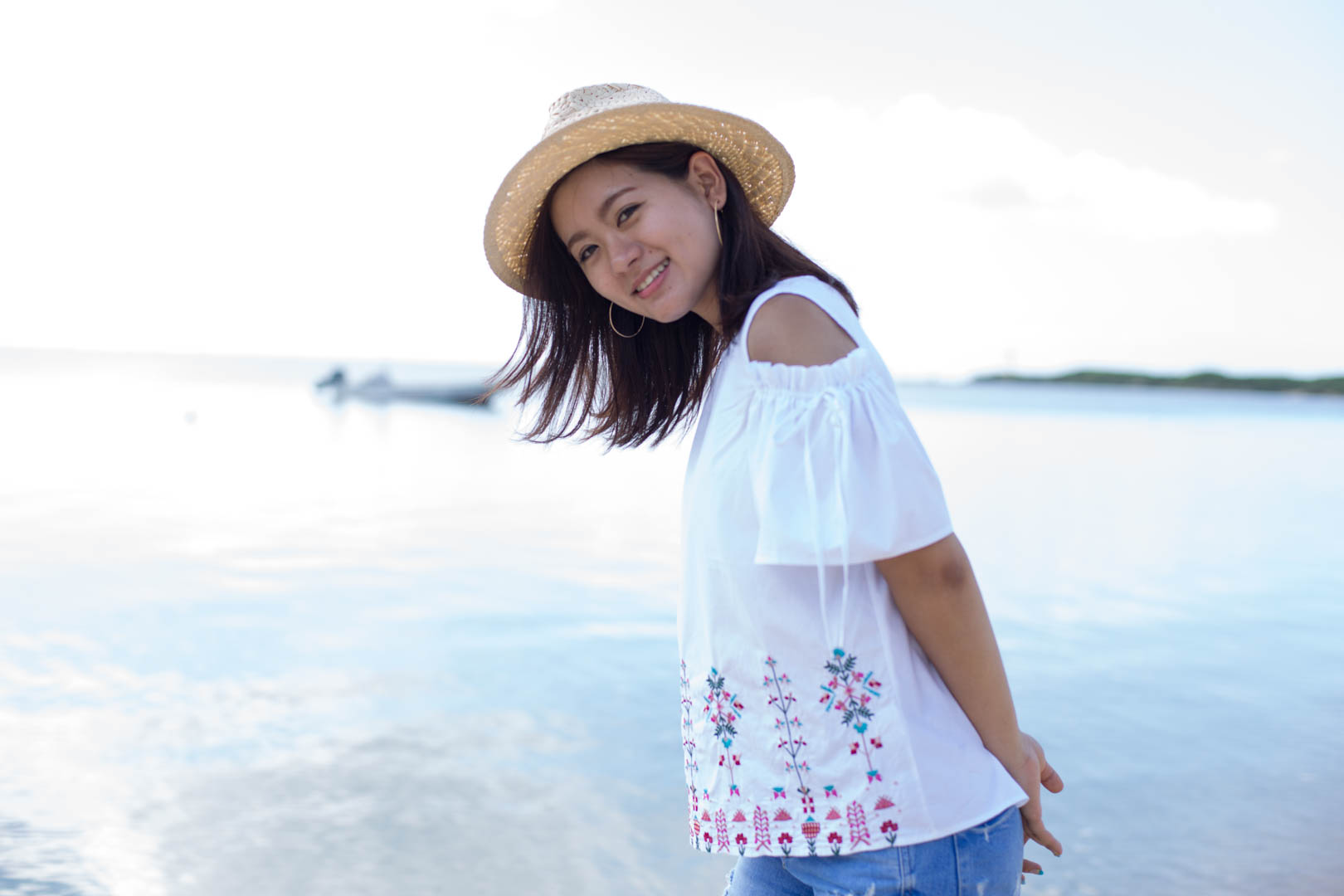 沖縄の海でこちら側へ微笑む女の子を撮影しました。