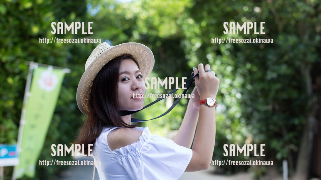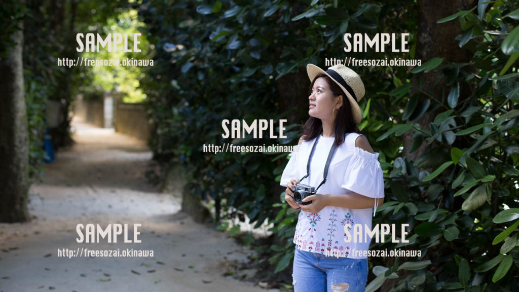 撮影場所:フクギ並木 フクギ並木でカメラを構える女の子を撮影しました。 背景画像や素材に使用できます。 -