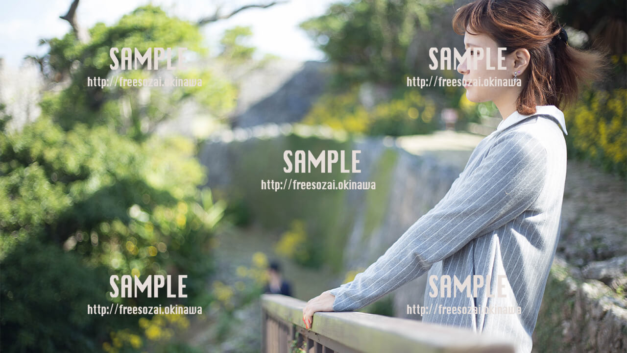 撮影場所:中城城跡 城跡から見える景色を眺める美少女の写真です。 壁紙や素材に使用できます。 -