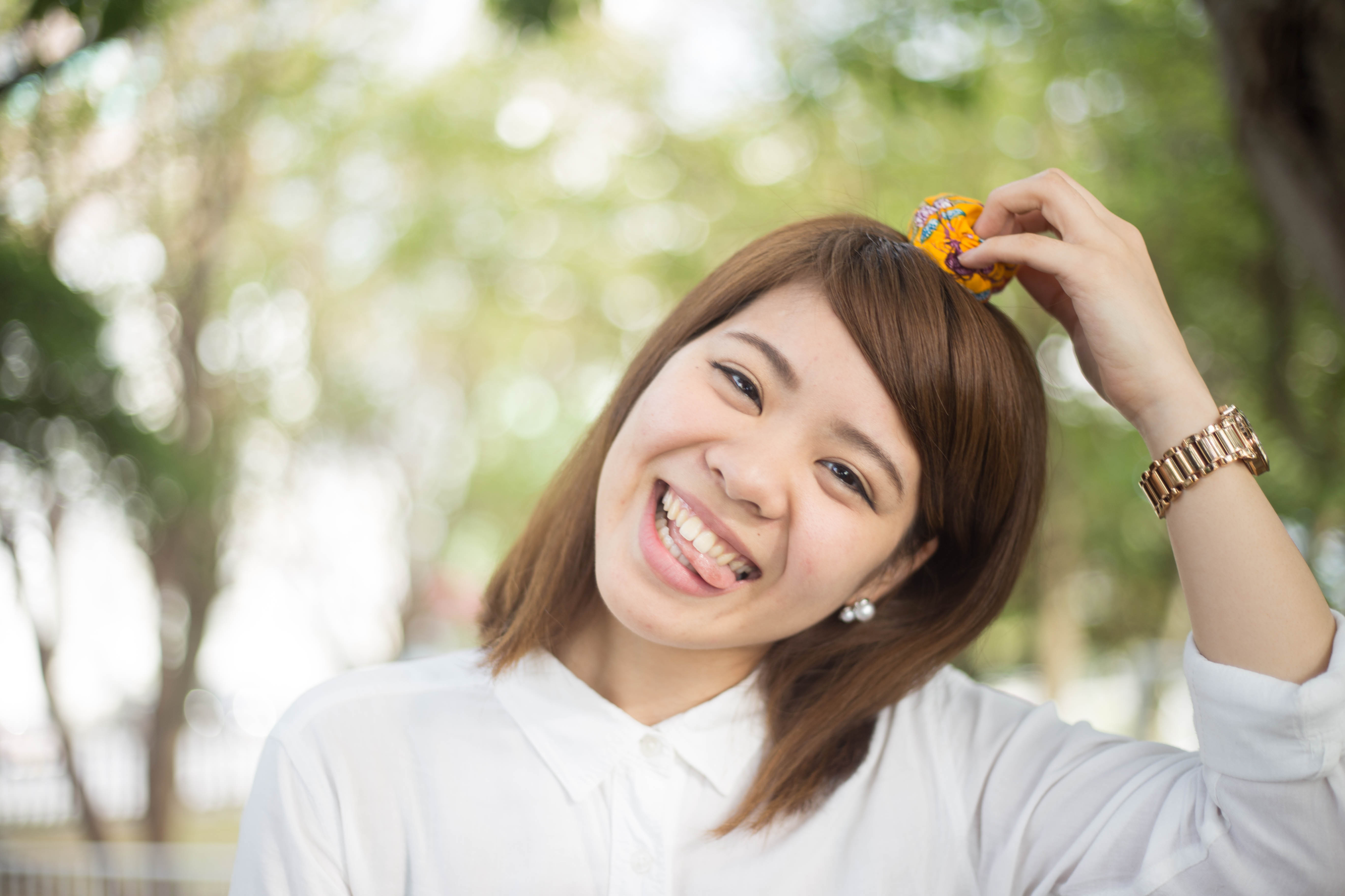 お手玉で失敗しておちゃめに照れる美少女の写真です。