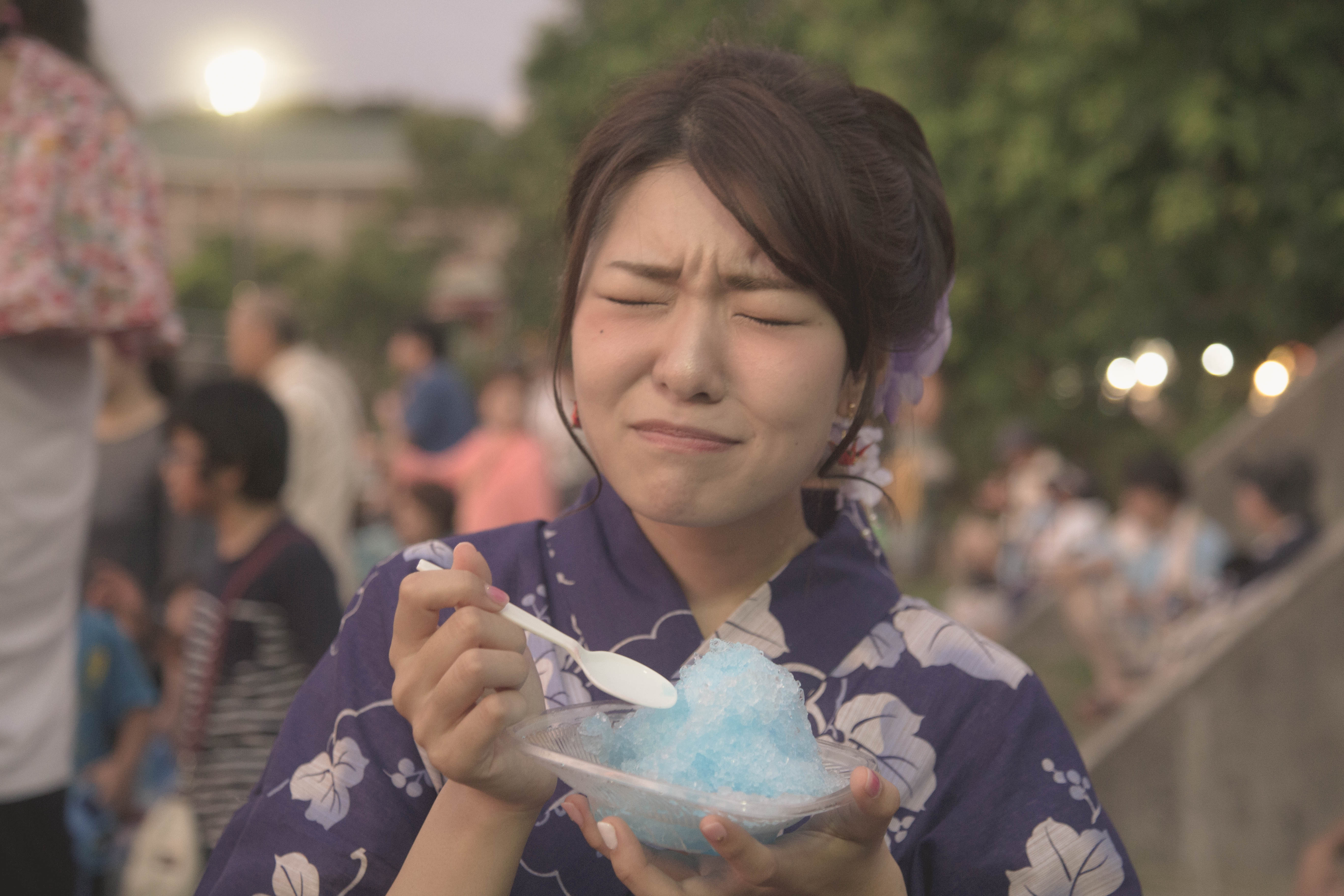 「かき氷冷たい!」と言いながらかき氷を食べている女の子。