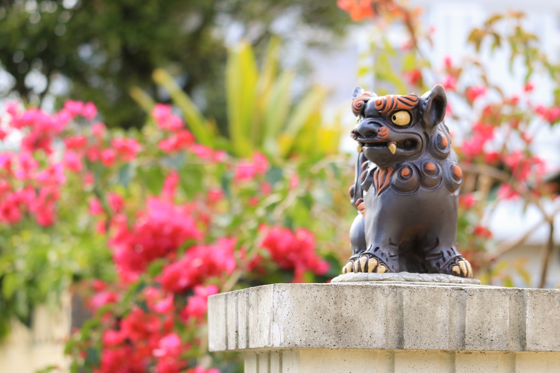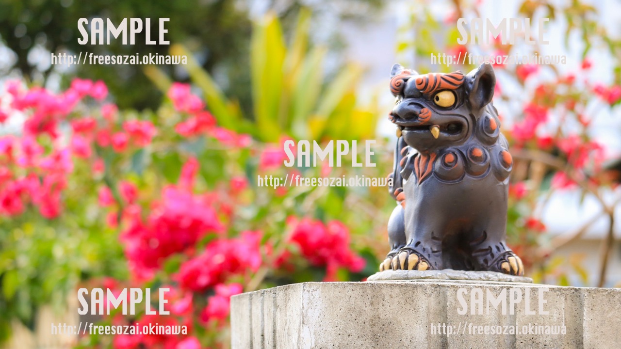 沖縄の守り神である「シーサー」とブーゲンビリアの花の無料写真素材です。