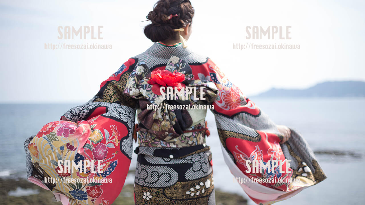 撮影場所:西原マリンパーク 振袖と沖縄の海の写真です。 壁紙や素材に使用できます。 -