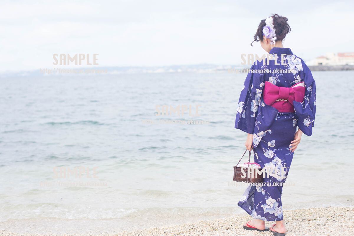 撮影場所:沖縄(ビーチ) 沖縄のビーチで撮影した写真です。 ビーチで浴衣美人。後姿が美しい。 背景画像や素材に使用できます。 -
