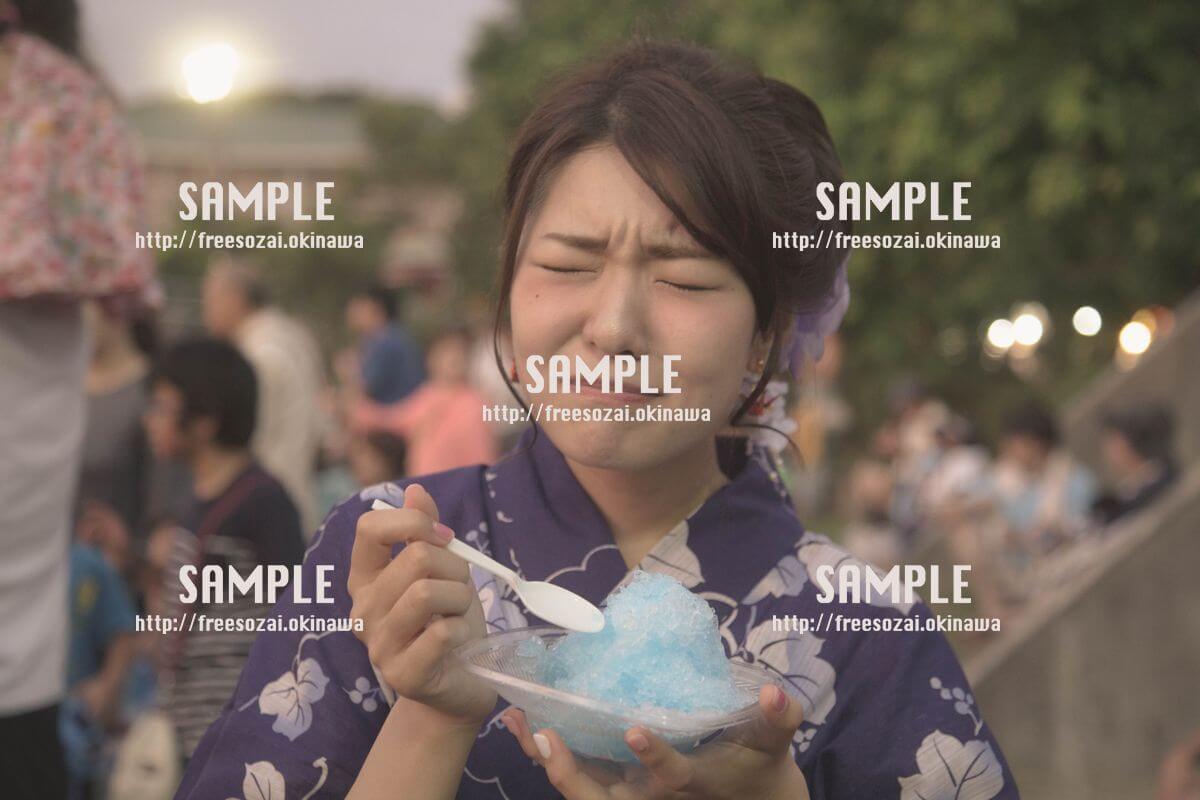 撮影場所:てだこ祭り 沖縄のてだこ祭りで撮影した写真です。 「かき氷冷たい!」と言いながらかき氷を食べている女の子。 背景画像や素材に使用できます。 -