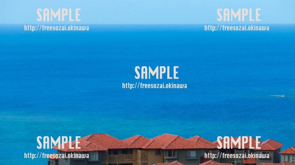 撮影場所:沖縄 沖縄で撮影された青い海と街の写真素材です。 背景画像や素材に使用できます。