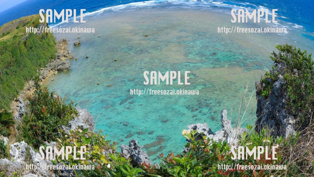 撮影場所:沖縄 沖縄で撮影された草木から見える青い海の写真素材です。 背景画像や素材に使用できます。 -