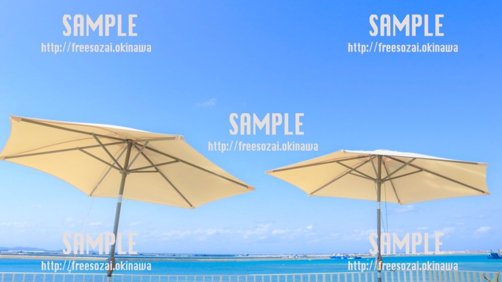 撮影場所:沖縄 沖縄で撮影されたビーチパラソルと青い空の写真素材です。 背景画像や素材に使用できます。 -